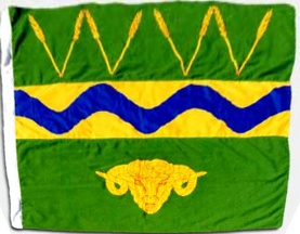 ARMS: Vert on a fess between in chief eight stalks of wheat each four in the form of the letter W and in base a Merino ram's head caboshed all Or a bar wavy Azure.