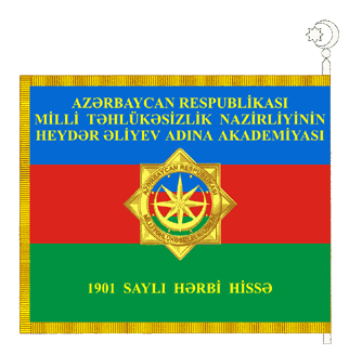 On the reverse of the flag, there is the emblem of the Ministry of National Security (height 54 cm) in the middle of the red stripe, the golden lettering AZƏRBAYCAN RESPUBLİKASI / MİLLİ TƏHLÜKƏSİZLİK NAZİRLİYİNİN / HEYDƏR ƏLİYEV ADINA AKADEMİYASI ("Heydar Aliyev" Academy of the Ministry of National Security ofthe Republic of Azerbaijan) in the blue stripe (letters, 6 cm x 5 cm), and the number and name of the unit (here, 1901 SAYLI HƏRBİ HİSSƏ [Military Unit No. 1901]) in gold (numbers 7 cm x 4.5 cm; letters 5 cm x 4.5 cm) in the green stripe.