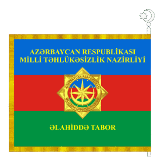 On the reverse of the flag, there is the emblem of the Ministry of National Security (height 54 cm) in the middle of the red stripe, the golden lettering AZƏRBAYCAN RESPUBLİKASI / MİLLİ TƏHLÜKƏSİZLİK NAZİRLİYİ (Academy of the Ministry of National Security of the Republic of Azerbaijan) in the blue stripe (letters, 6 cm x 5 cm), and the name of the unit, ƏLAHİDDƏ TABOR, in gold (numbers 7 cm x 4.5 cm; letters 5 cm x 4.5 cm) in the green stripe.