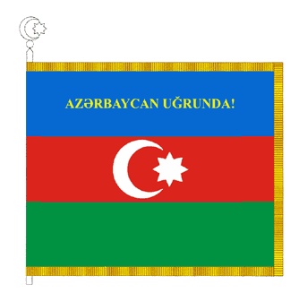 The flag measures 114 cm x 145 cm and is horizontally divided blue-red-green, like the national flag of Azerbaijan. On the obverse of the flag, there is a white crescent (height 38 cm) and eight-pointed star (height 20 cm) in the middle of the red stripe and the golden lettering AZƏRBAYCAN UǦRUNDA! (For Azerbaijan!) in the blue stripe. The letters are 6.5 cm high and 5 cm wide.