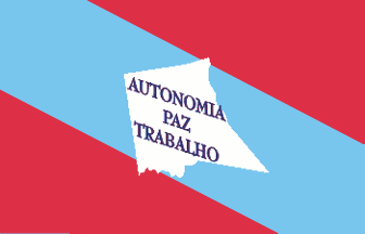 Divided per bend red-light blue-red, with a white map of the municipality centred, bearing the words AUTONOMIA PAZ TRABALHO.