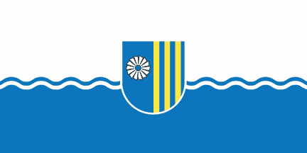 White over blue bicolor, wavy border, with blue/white wavy line, centred shield.