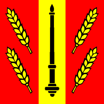 Gules between four Ears of Wheat Or two dexter bendwise and two sinister