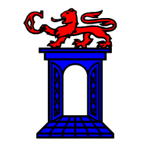 Argent lion passant holding a letter C gules standing on a carriage entrance azure.
