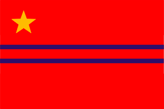 Designed by Xiao Shu Hua. The red flag with red star in white canton charged with two blue horizontal bars.