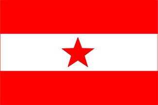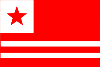 Designed by Xiao Shu Hua. The red flag with red star in white canton and two white horizontal bars lower part.
