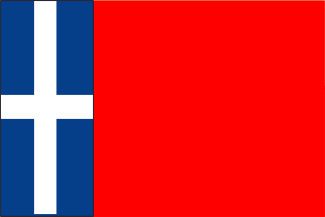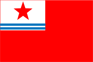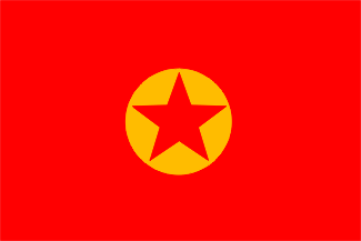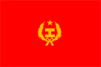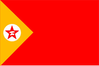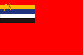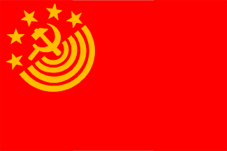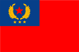 Designed jointly designed by Zhang Ding and Zhong Ling. The red flag with red star surrounded by yellow wreath and three yellow stars beneath in blue canton.