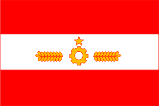 Designed by Cheng Lu. The red flag with red star and yellow wreath in white cog in canton.