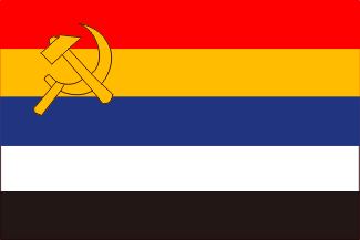 The first republic flag of red, yellow, blue, white and black horizontal five stripes with yellow crossed hammer and sickle in canton.