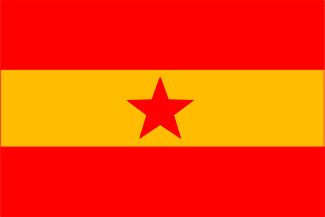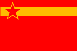 Designed jointly designed by Zhang Ding and Zhong Ling.  The red, yellow, red horizontal three stripes with yellow fimbriated red star in top stripe, red crossed hammer and sickle in middle stripe and yellow three stars in bottom stripe.