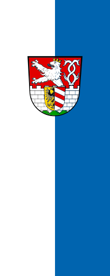 It is a white-blue vertical bicolour. The coat of arms is shifted towards the top.