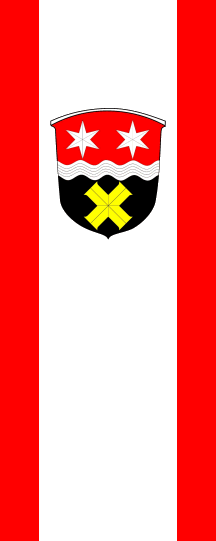 It is a red-white-red vertical triband with ratio of stripes approx. 1:4:1. The coat of arms is shifted to the top within the central stripe.