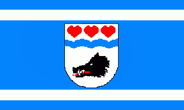 The ratio of the flag is 3:5. It is a blue flag with horizontal white stripes. The edges are blue. The ratio between the stripes is approx. 2:2:9:2:2. The coat of arms is in the centre of the flag.