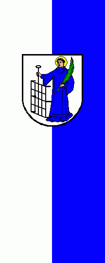 It is a white-blue vertical bicolour. The coat of arms is shifted towards the top.