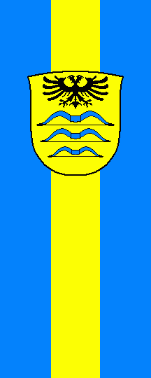 It is a blue-yellow-blue vertical triband. The coat of arms is shifted to the top.