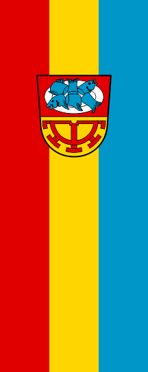 It is a red-yellow-blue vertical tricolour. The coat of arms is shifted towards the top.