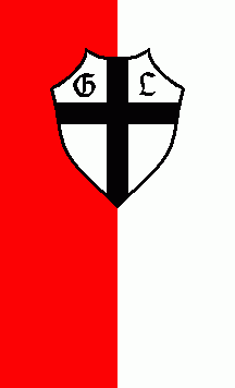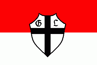 Shield Argent parted by a Latin cross Sable, on the upper quarters are Gothic initials Sable "G" above right and "L" above left.