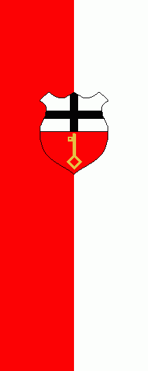 Shield Gules a key Or in pale, chief Argent parted by a centred cross Sable.