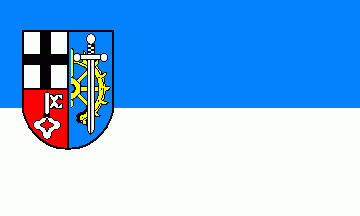It is a blue-white horizontal bicolour with coat of arms in canton.