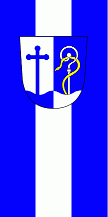Main field and base are divided per fess wavy. The main field is divided per pale into silver (= white) and blue. The dexter side displays a blue cross staff issuant. The sinister side displays a silver (= white) crozier issuant intertwined by a golden (= yellow) serpent. The base is divided per pale into blue and silver (= white).