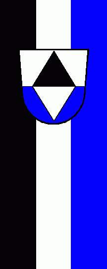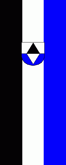 It is a black-white-blue vertical tricolour. The coat of arms is shifted towards the top and edited in a normal size (see left image above) or a small size hardly exceeding the white stripe (see right image above).
