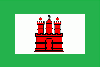 The ratio is approx 2:3. The white flag has a green bordure. In its centre is a red Hamburg castle, version with close door.