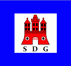 The ratio is approx 11:12. The white flag has a blue bordure. In its centre is a red Hamburg castle, version 19th century. Beneath the castle are black capitals "SDG", probably meaning : "Soli Deo Gloria", (English: glory to God alone/German: Gott allein die Ehre), the motto of the family also appearing in the coat of arms.