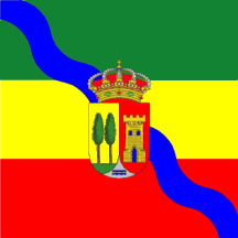 Flag: Four-colored. Three horizontal stripes of equal height (1/3). First, vert or green; second, or or yellow; third, gules or red. A wavy blue stripe of 1/10 running from the upper right corner to the lower left corner of the flag. In the middle is placed the municipal coat of arms.