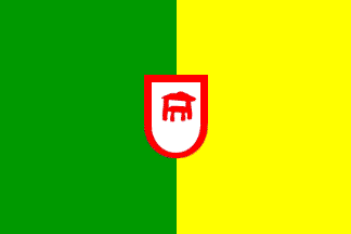 Flag: Rectangular panel, in proportions 2:3, made of two equal vertical stripes, green at hoist and yellow at fly. In the center a white shield with a red dolmen and a red border.