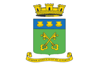 photo) is white with the municipal coat of arms, "Vert, two keys or in saltire a chief azure three escallops or".