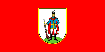 The flag is in proportions 1:2, red with the coat of arms, bordered yellow, in the middle.