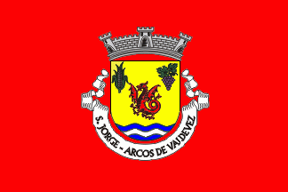 Shield Or with base wavy of Azure and Argent, a dragon rampant Gules, accompanied by a corn cob Argent leaved Vert in dexter chief and a grapevine Purpure leaved Vert in sinister chief. Mural crown Argent with three visible towers (village rank) and white scroll with inscription in black initials "S. JORGE - ARCOS DE VALDEVEZ".