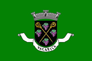 Shield Sable, four grapevines Purpure leaved Vert ordered per saltire, separated by two croziers Or in saltire. Mural crown Argent with three visible towers (village rank) and white scroll with inscription in black capitals "VACARIÇA".