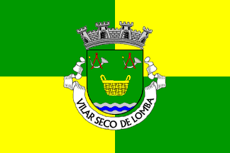 The shield of the arms is Vert, a basket Or emphasized Sable, in chief two hunting horns Argent stringed Gules with embouchures Or, on base wavy Argent a barrulet wavy Azure. Mural crown Argent with four visible towers (town rank) and white scroll reading in black upper case letters "VILAR SECO DE LOMBA"