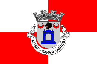 The arms are Argent a domed baptismal font Azure with pyramidal capitals and in chief a wolf head erased Sable langued and armed and eyed Gules facing dexter between two crescents Gules pointing upwards. Mural crown Argent with four visible towers (town rank) and white scroll reading in black upper case letters "AGUIAR - VIANA DO ALENTEJO".