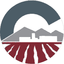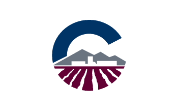 The flag consists of the city logo centered on a white field. The letter "C" represents the city's name and the sky over the San Tan Mountains. The mountains silhouette the growing urban area. Before the city lie irrigated