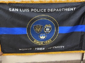 In this article by a news organization named the Yuma Sun, a photograph of the flag of the Police Department of San Luis, Arizona is seen.