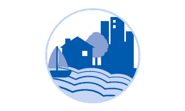 The flag of Maryland Heights can be seen in a photograph on the city's website that shows the Maryland Heights flag flying alongside the American and Missouri flags. The flag itself features the circular city logo in three shades of blue centered on a white field. The logo shows the silhouettes of a house and skyscrapers in dark blue along a waterfront in light blue. The silhouette of a sailboat on the water is in dark and medium blue, with a