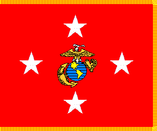 The flag displayed by the Commandant of the Marine Corps is interesting inasmuch it is a combination rank flag/U.S. Army-type positional color. It displays the four stars of the Commandant's rank in the diamond pattern used on regular Navy and Marine Corps rank flags, but with the badge of the USMC inside the stars. It is also larger in size than the normal 3' hoist by 4' fly rank flags, being 4' on the hoist by 5'6" on the fly -- thus conforming to the dimensions of the positional colors of the other service chiefs.